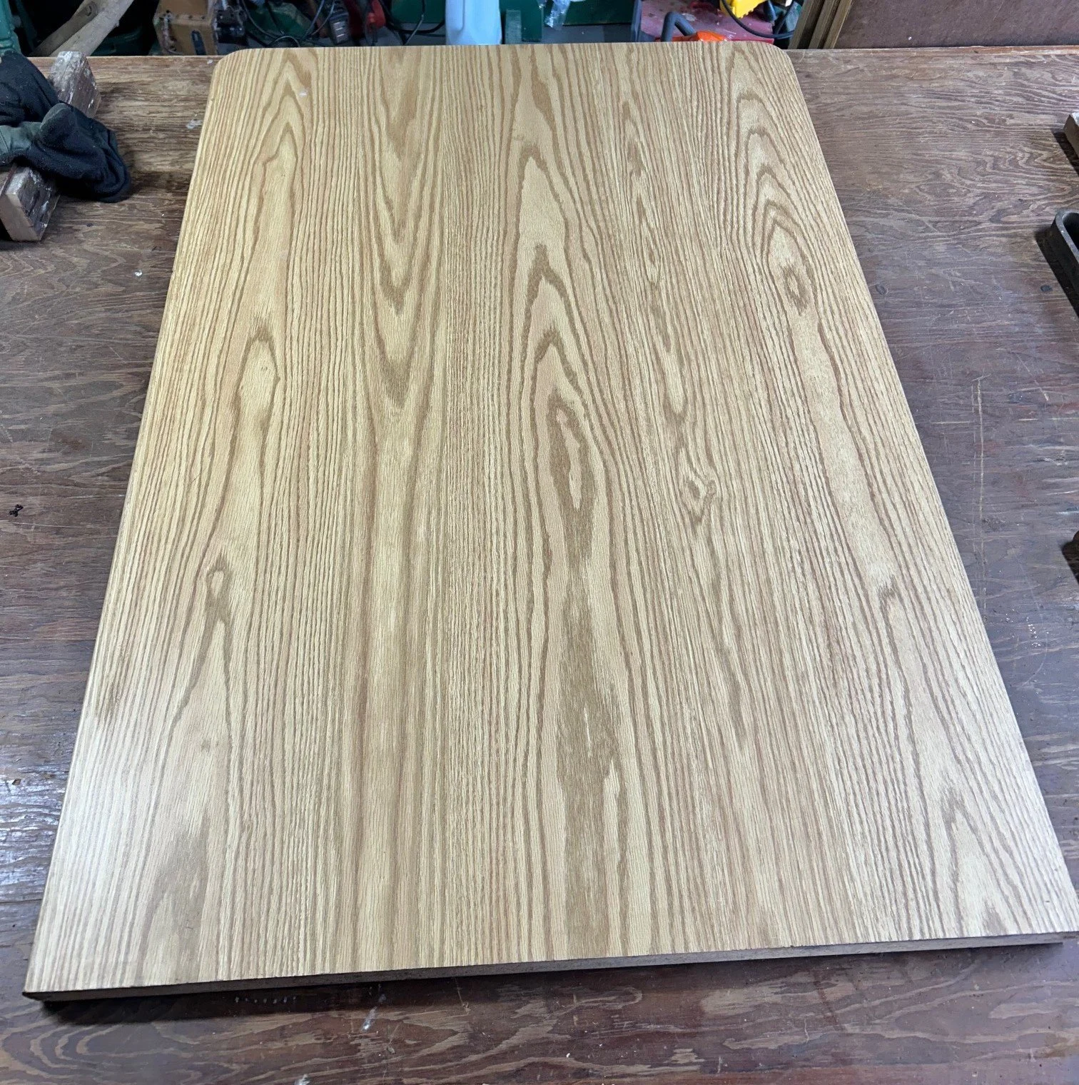 Laminated pressboard, rounded on one end and squared on the other. The squared end is unfinished. Likely these were used coming off of a wall. Could become a breakfast bar, work table…a variety of uses. 9 of these initially came in, please inquire as to current availability. 30” x 45” $15 each