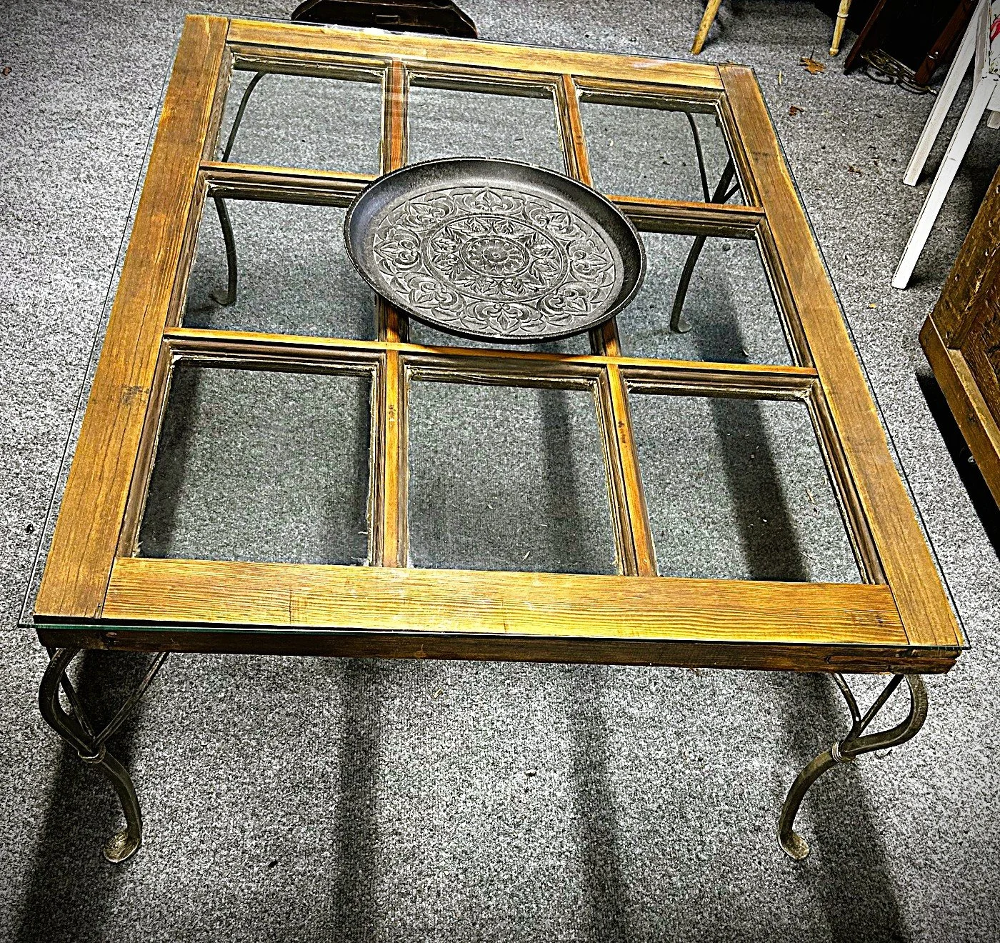 Created from a discarded door, this table also has funky metal legs salvaged from another table headed to the dump and a custom made glass top. (42” x 32” x 18”H) $190