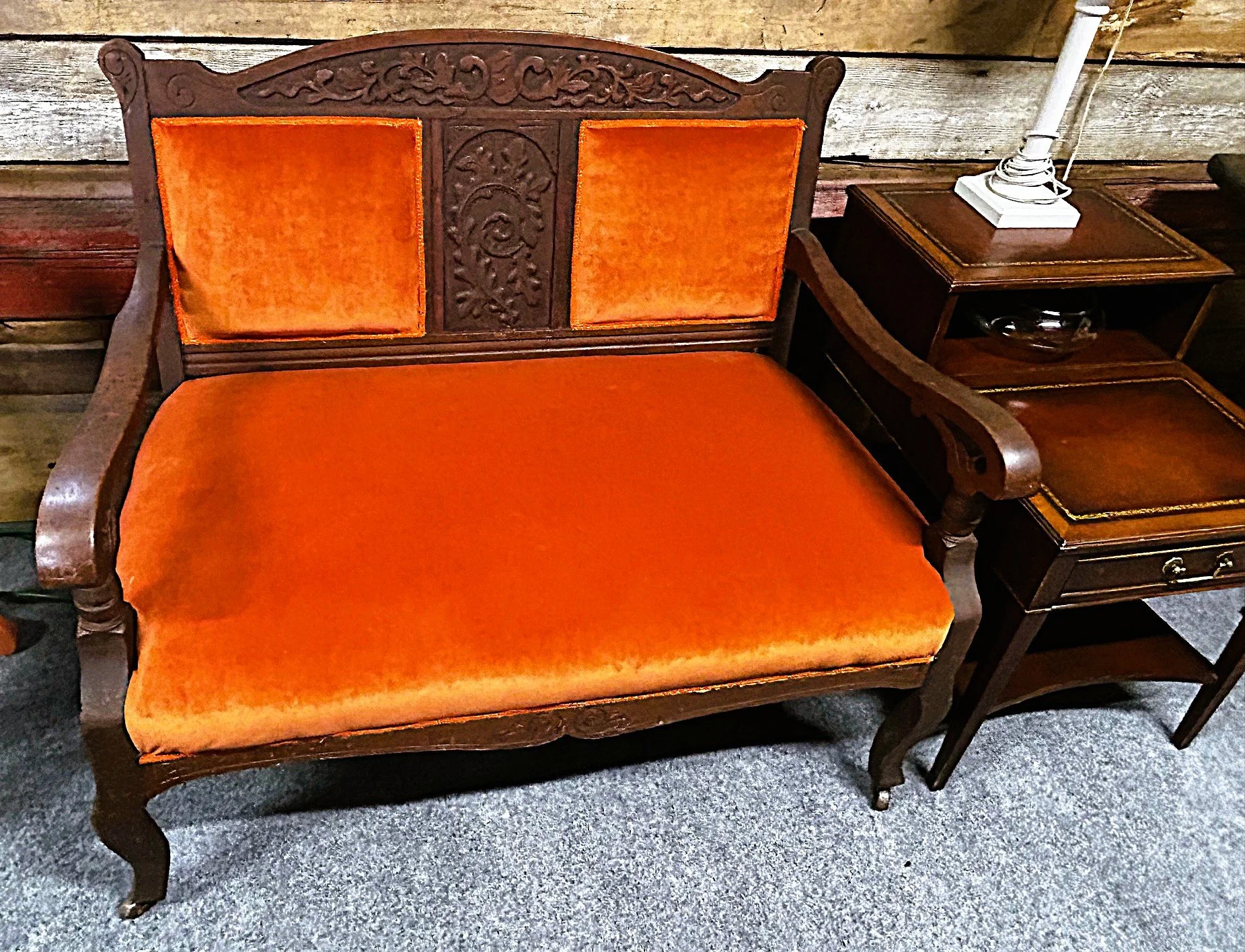 What began as something I was going to use for piece-parts ended up being a restoration of this beautiful item. 8-way hand tied spring construction all redone with rust velvet matching what I found under 2 other layers on top of it. (39”W x 24”D) $850