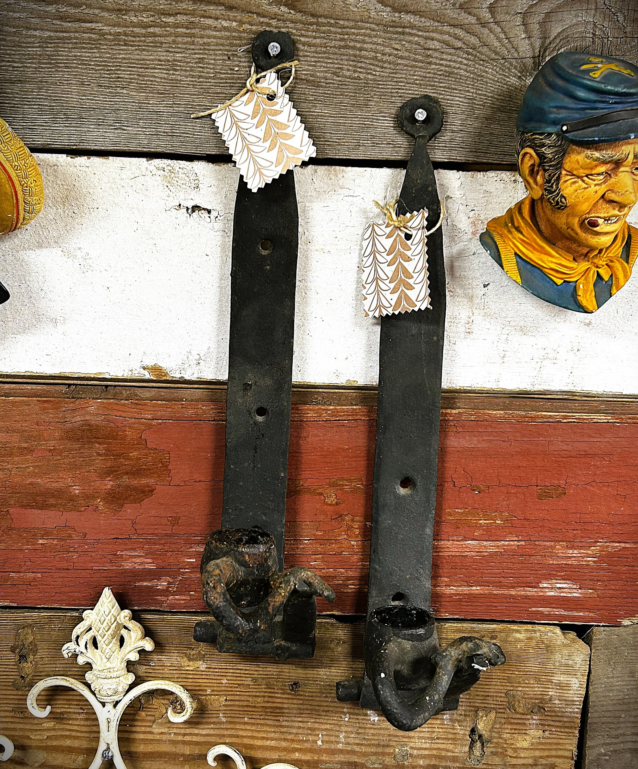 Fun items where someone repurposed big strap hinges and decorative pieces to create something unique.