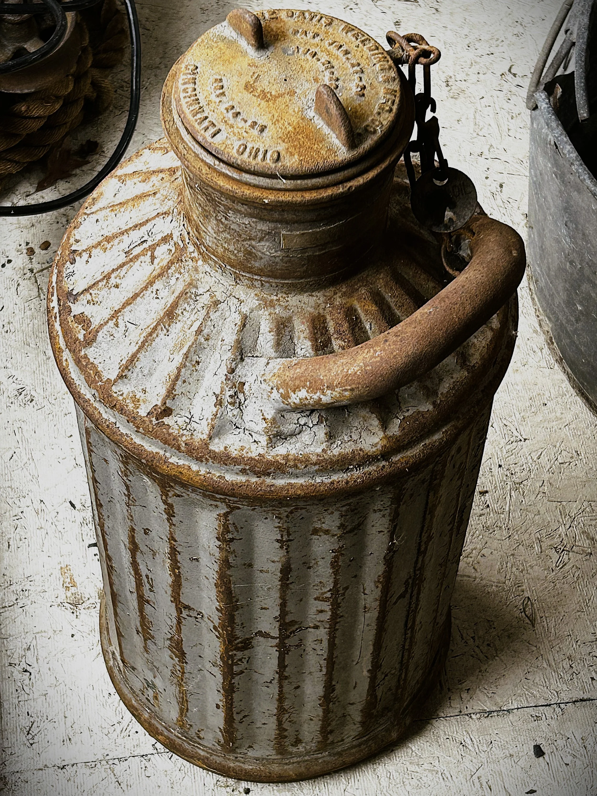 Early 1900’s 5 gallon oil can from the Davis Welding & Mfg Co in Cincinnati, OH with a Mobil Oil tag on it. Currently have two of these