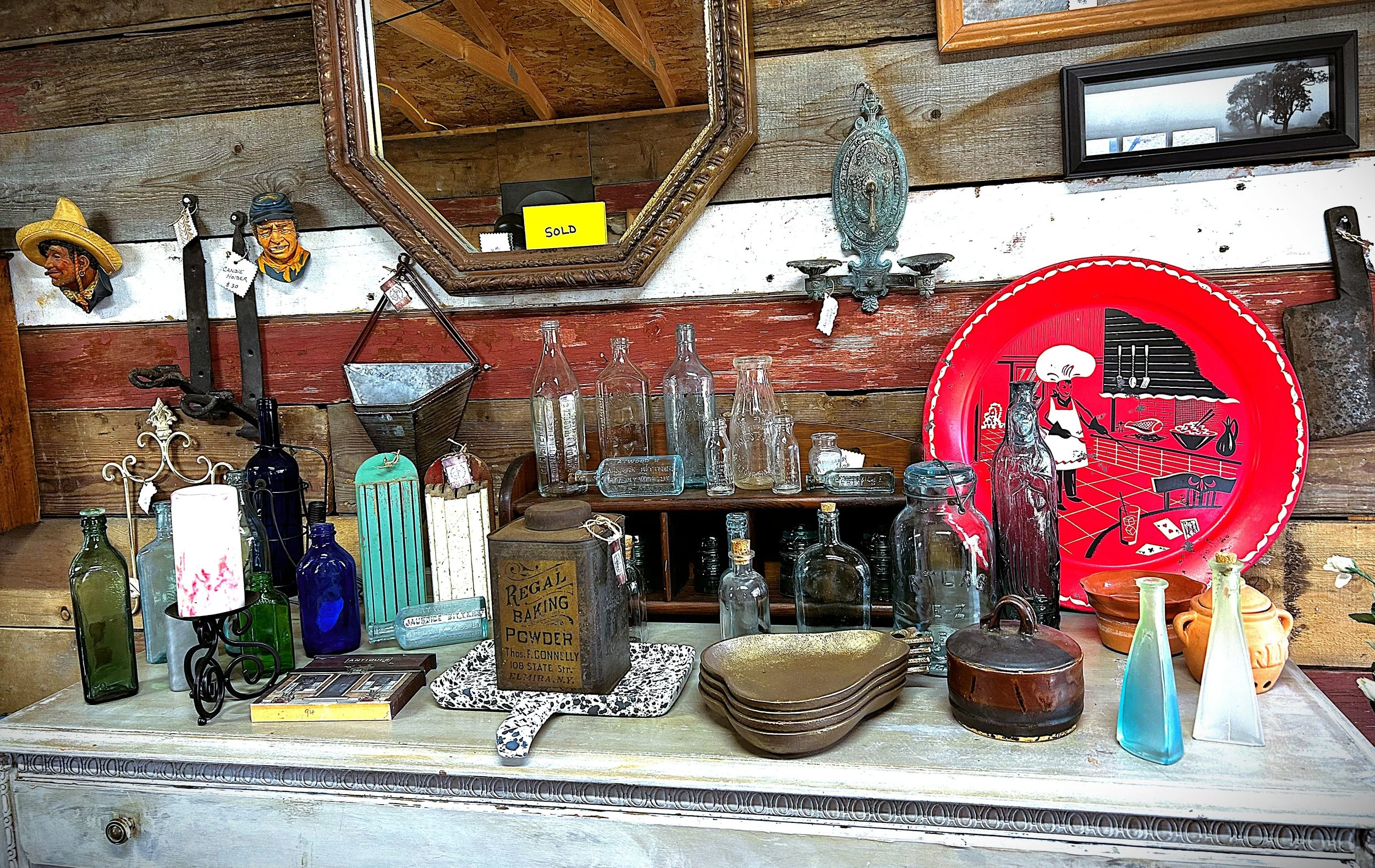 We always have various apothecary and other bottles along with vases, candle holders, flower pots, etc etc.
