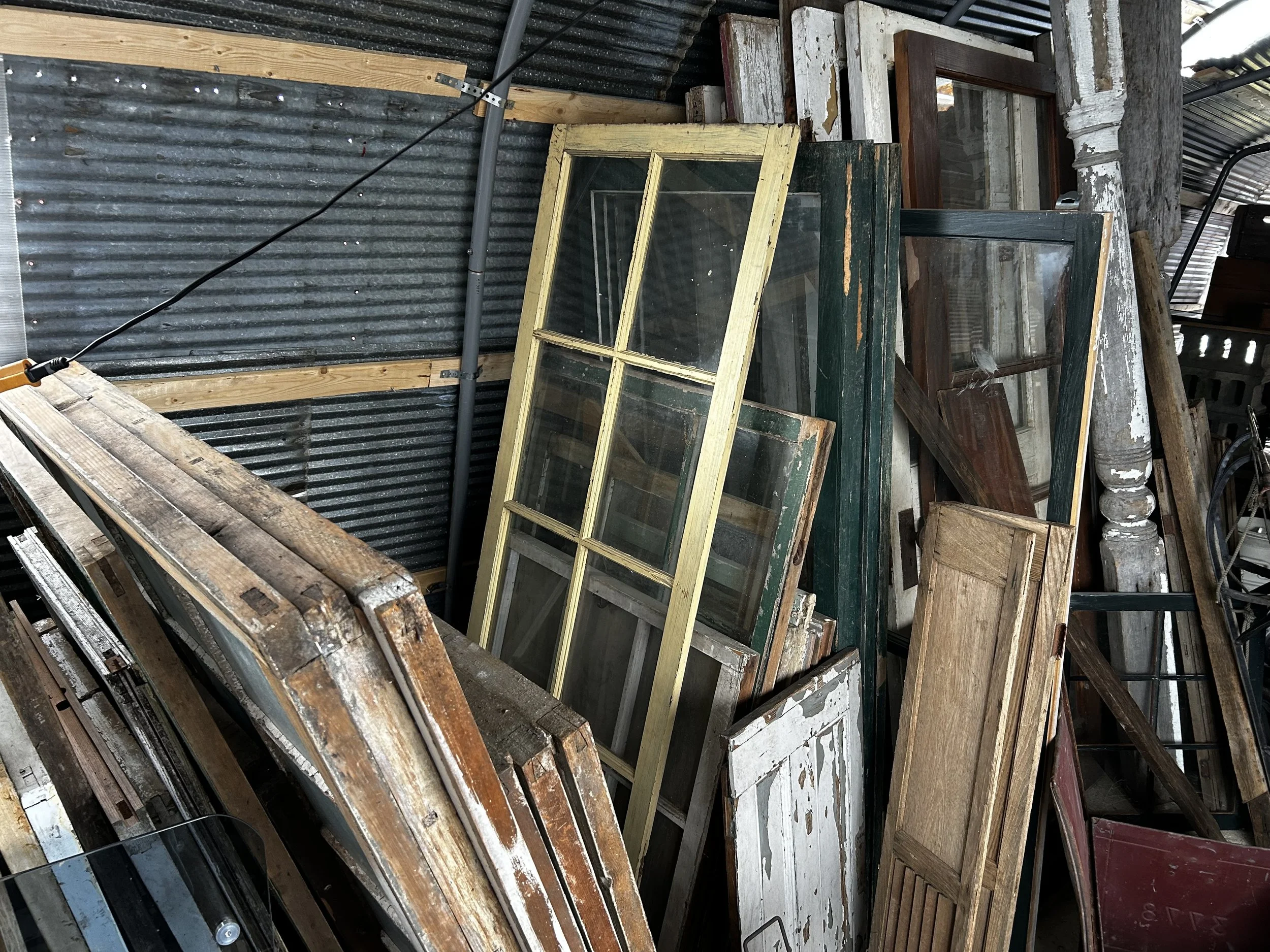 This is just too much of a jumble to present properly until they are all sorted and measured during our off season! Suffice it to say we have a lot of old wood windows, shutters and doors…