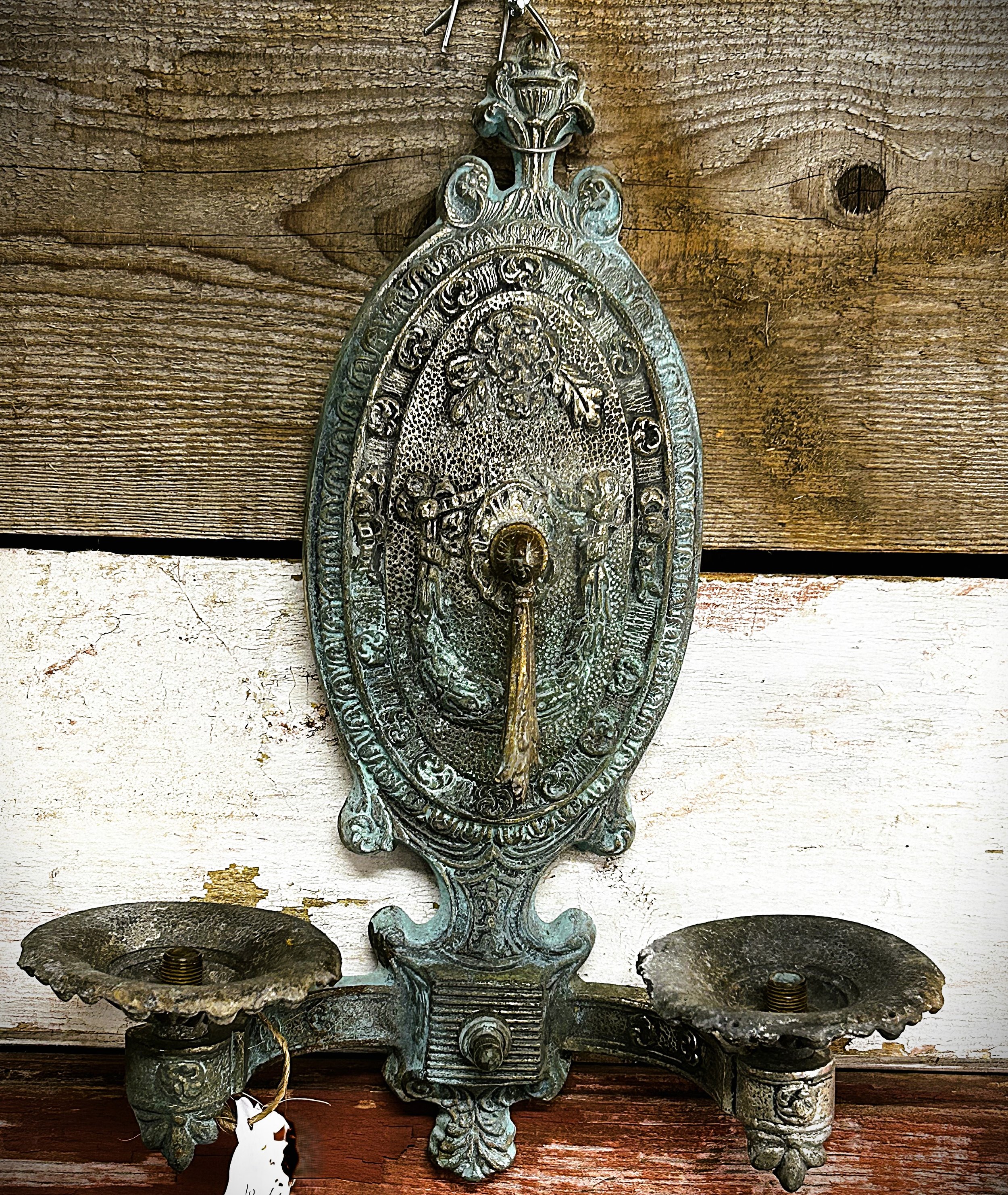 These sconces swivel in their bases. Nice cast iron pieces and some salvaged door hardware for accents. $20 each