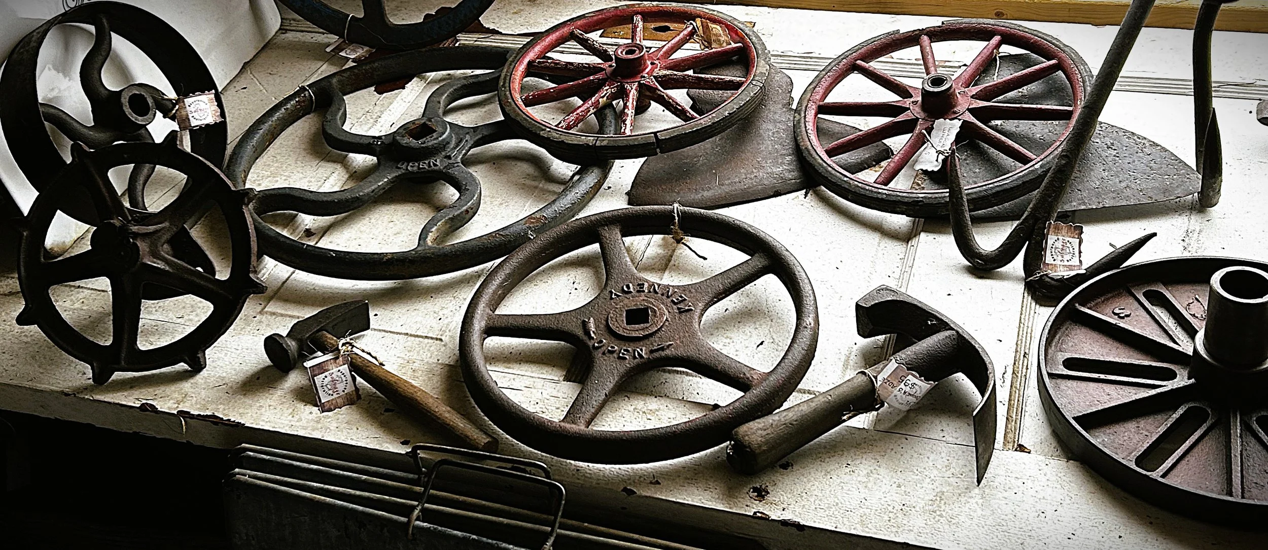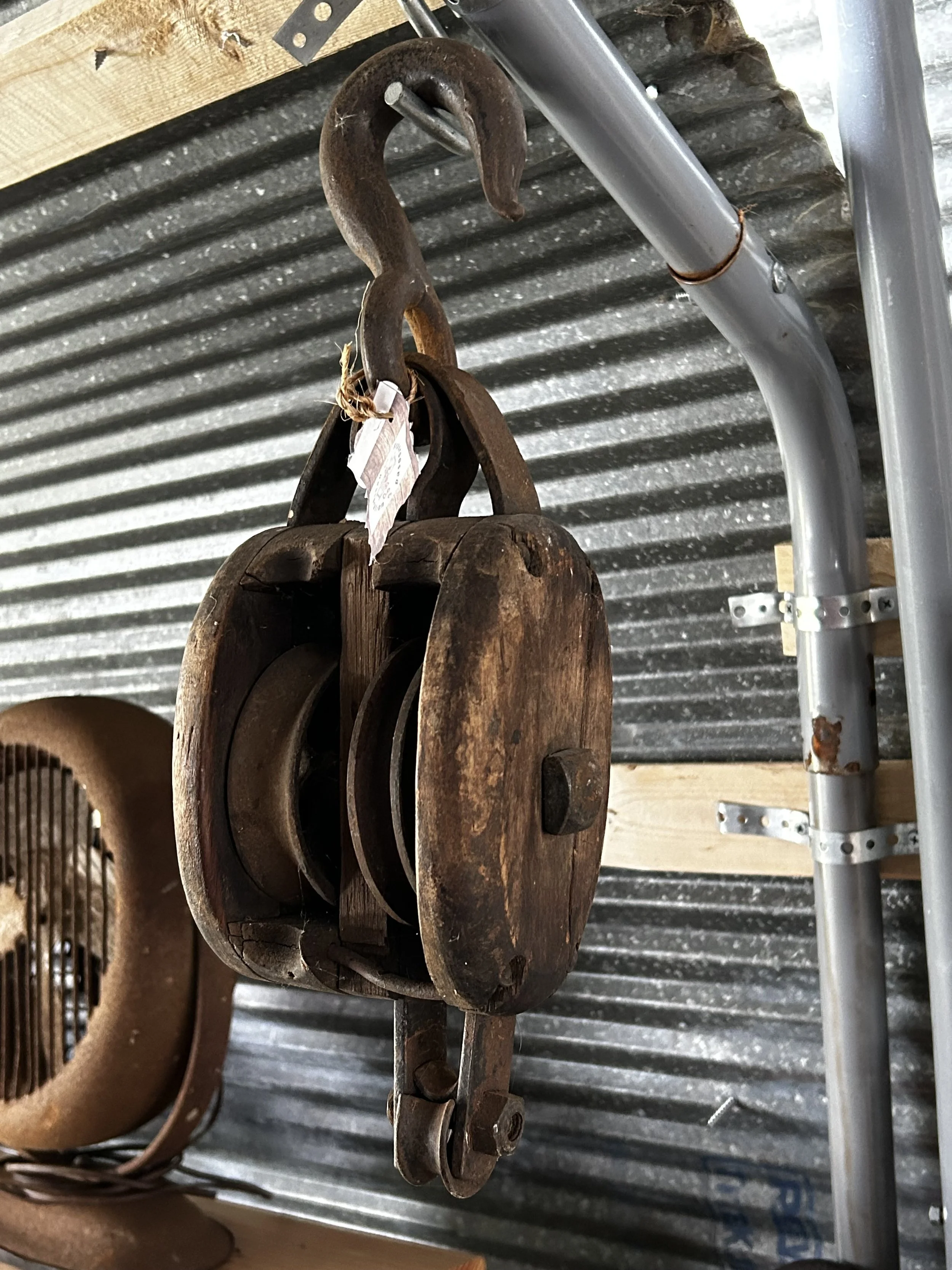 Big pulleys, small pulleys, single pulleys, double pulleys…all your vintage block and tackle needs, or at least a good selection…