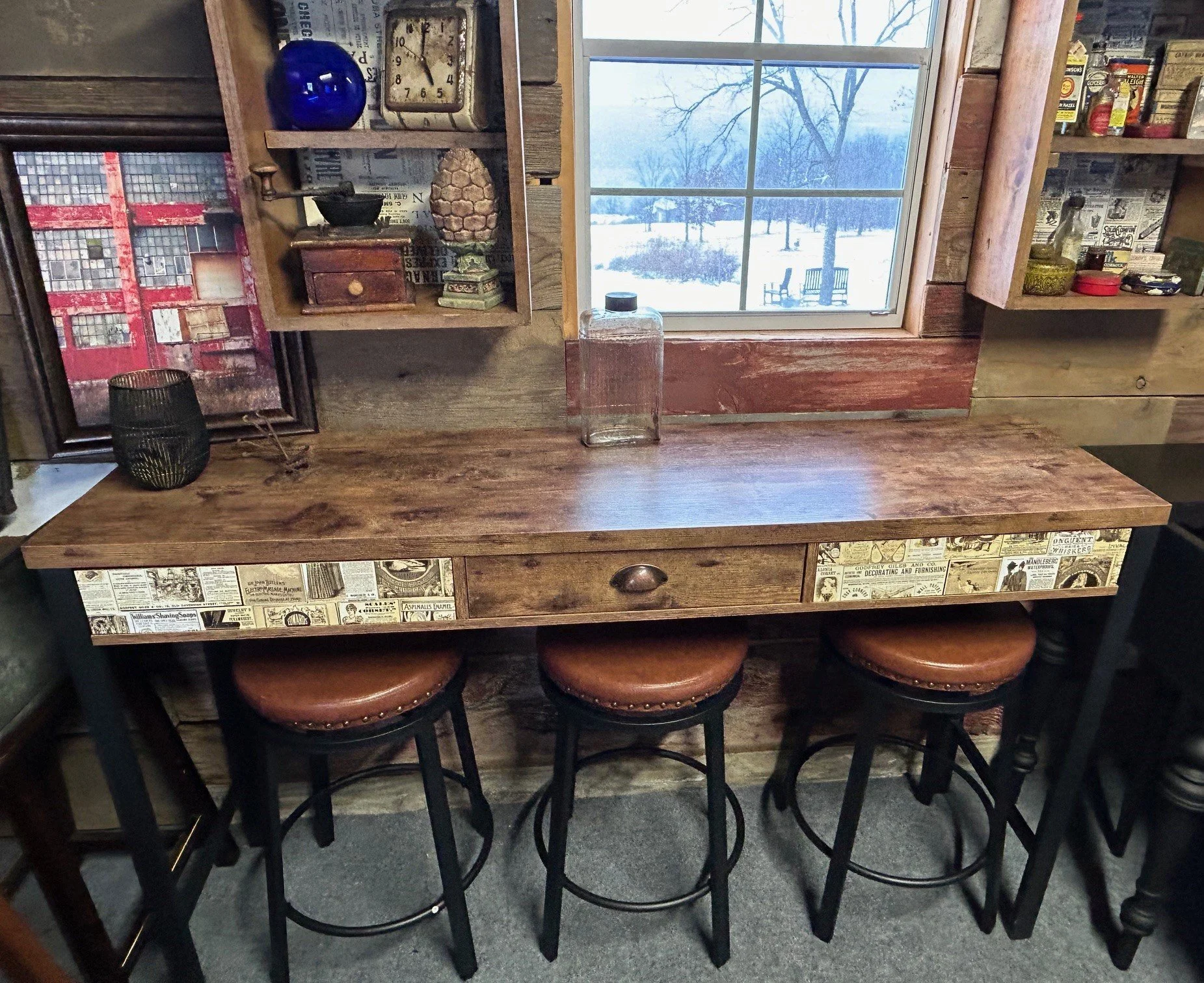 This was (salvaged) from an interior design project and given a second chance with some fun paper added to the facing. Comes with 3 stools. (60”W x 15”D x 33”H) $120