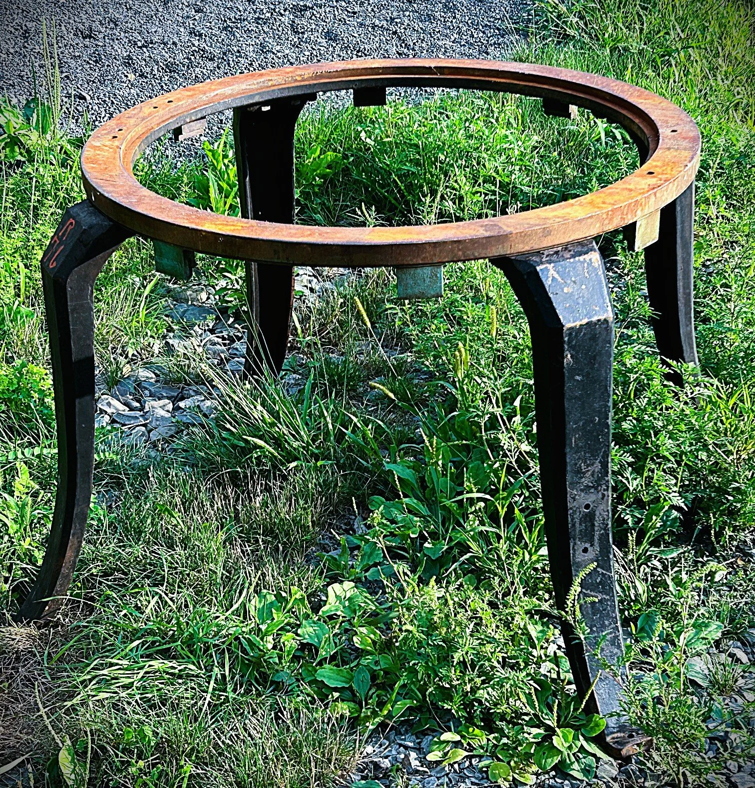 Salvaged (heavy) steel base from a machine in a textile mill. This will make a great table base or, as one customer pointed out, putting a big caldron-type pot hanging inside it for cooking over a fire!